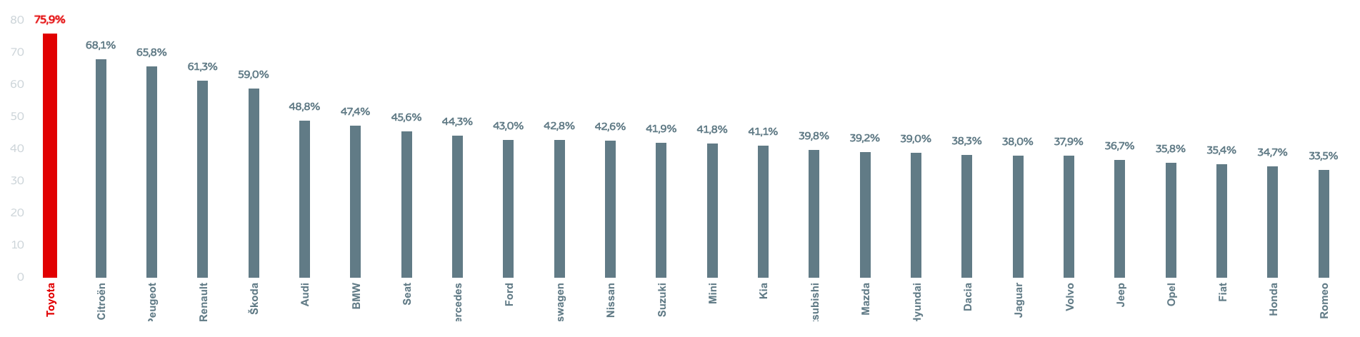 „Mimo rozbudowanej sieci autoryzowanych serwisów Toyota nie pozwala sobie na wpadki. Klienci jej ASO doceniają staranną obsługę, przejrzystość komunikacji oraz zaufanie, jakie wzbudza praca serwisantów. Nie bez znaczenia są też akceptowalne ceny, duża sieć placówek, które świadczą usługi na wysokim poziomie. Według ankietowanych nie zdarzają się sytuacje, że „serwis rozkłada ręce” (Motor nr 43-44/2021, s 39)
